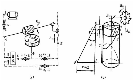 凌機圓柱斜齒輪表示從傳動原理圖a) 可以看出,滾切斜齒齒輪時必須有四條傳動鏈: